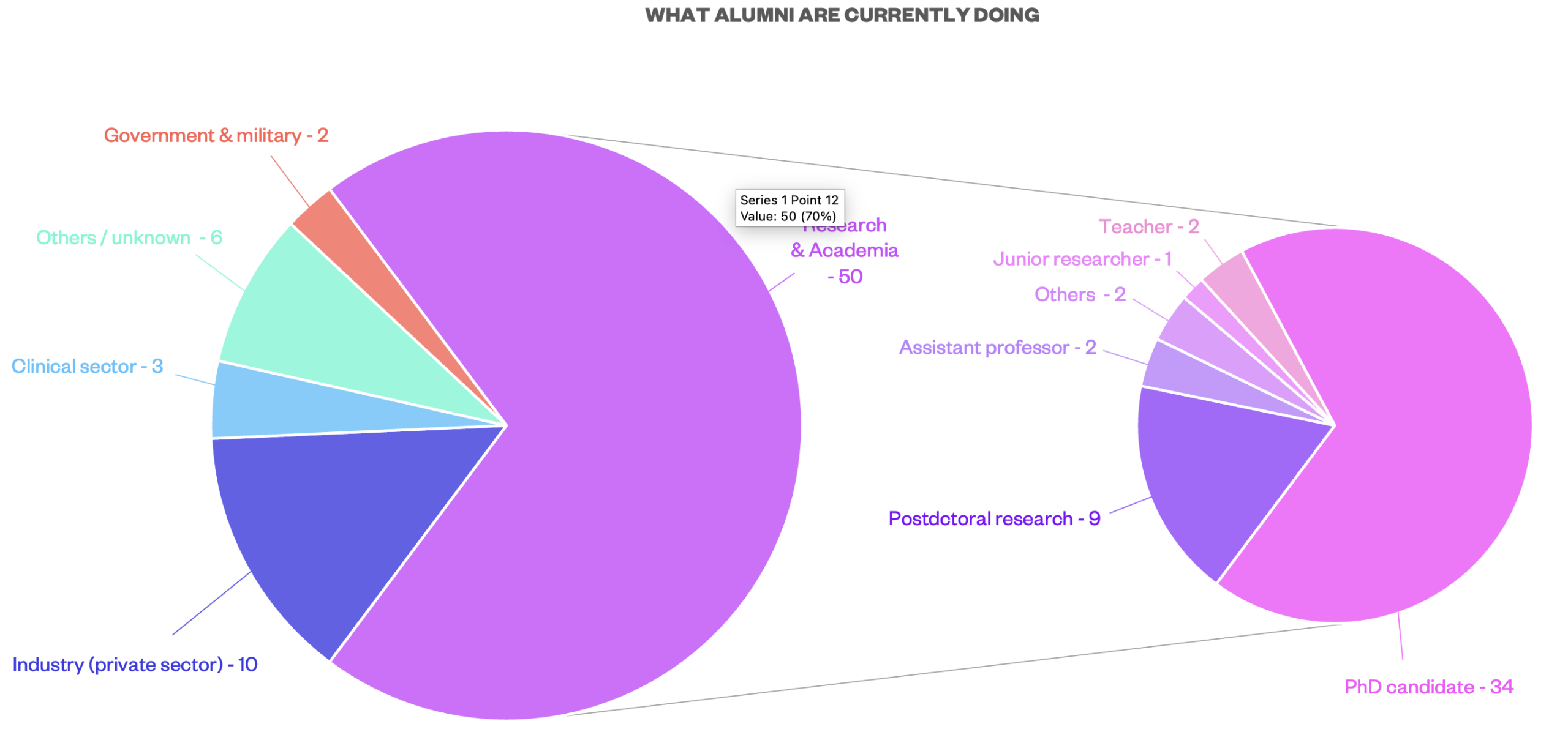 Most of our alumni choose to pursue a PhD: among those who graduated in or before 2024, 70% are currently PhD candidates or have completed a PhD.